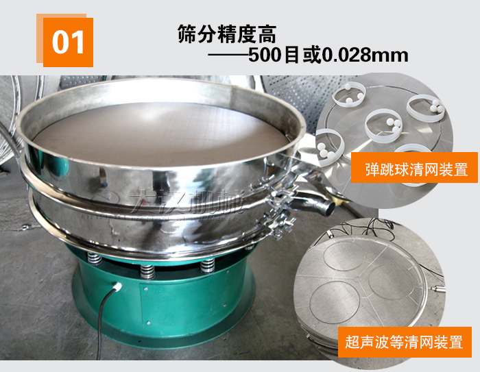 旋振筛筛分物料范围广,500目或0.028mm的颗粒及粉状物料均可以高效筛分,另外,我们厂家生产的旋振筛设备还设置有弹跳球、超声波等清网装置,针对有些精细粉状物料,我们的旋振筛设备可以很好地降低粉状物料因静电,比重轻等因素造成的堵塞网孔的现象。