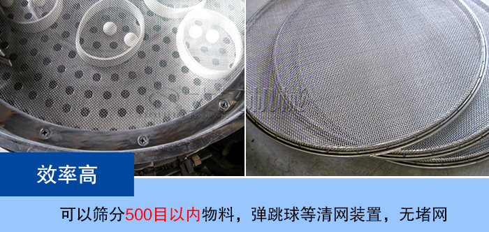 双层旋振筛可以筛分500目以内粉状及颗粒状物料,也可过滤5微米的浆液物料,筛分除杂效果好,,每小时可以处理1-5吨左右的物料,另外,我们的双层旋振筛还加装了弹跳球等清网装置,设备无明显的堵网现象,筛分效率高。