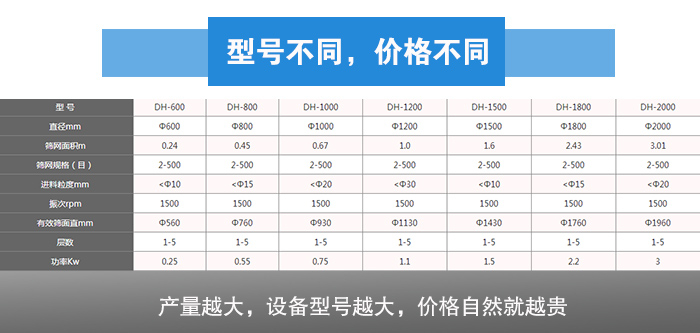 用户对于面粉筛分产量的要求就决定这不锈钢旋振筛的价格,而筛分面粉的不锈钢旋振筛型号有DH400、DH600、DH800、DH1000、DH1200、DH1500、DH1800、DH2000等,不同型号的不锈钢旋振筛对应的产量是不同的,如果面粉的产量在500kg/h及以下就可以选择DH400、DH600不锈钢旋振筛,每小时产量在500-1200kg之间需要选择DH800、DH1000、DH1200等型号,产量越大,设备型号越大,价格自然就越贵。