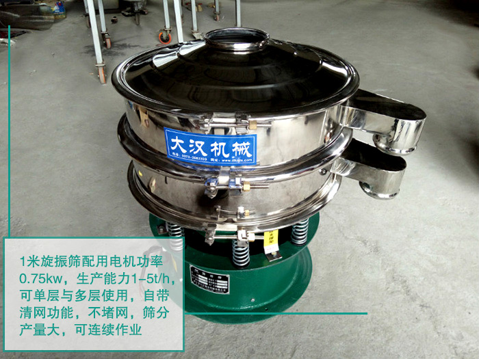 1米旋振筛配用电机功率0.75kw,生产能力1-5t/h,可单层与多层使用,可装单层对鱼粉进行除杂,也可以装多层筛网,对鱼粉实现分级功能。 同时自带弹跳球,自带清网功能,不堵网,筛分产量大,可连续作业。特别适合高品质、精细粉体的用户使用。