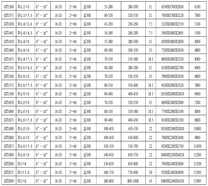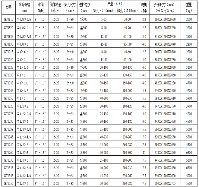 GTS系列矿用滚筒筛技术参数: