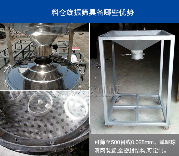 关于设备质量:料仓旋振筛采用不锈钢或碳钢材质,做工精良,其质量要比厂家更优,寿命延长3-5年左右。