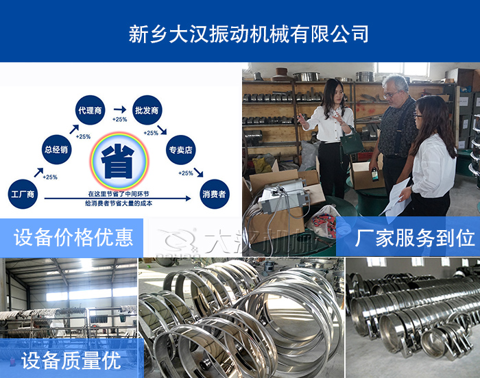关于设备价格:厂家从用户角度出发,遵从大多数用户的购买心理,单台设备利润少,价格更平民化、经济化,大汉料仓旋振筛厂家直销,价格更便宜。